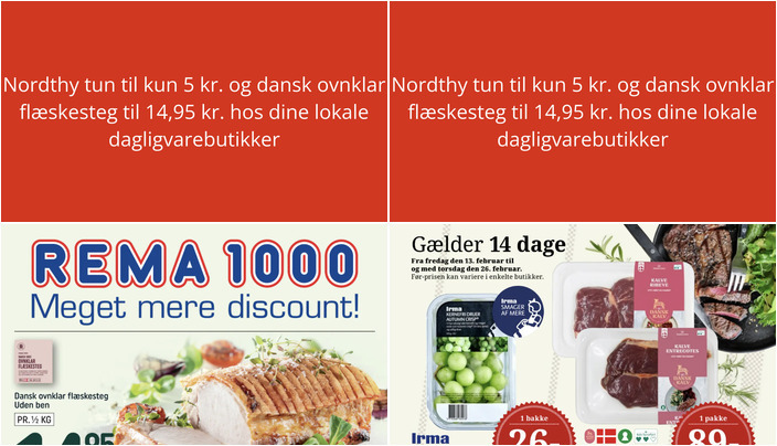 Rema 1000 tilbyder en lækker dansk ovnklar flæskesteg uden ben til kun 14,95 kr. pr. ½ kg. Dette tilbud er perfekt til en hyggelig middag. Tilbuddet gælder fra søndag 22. februar til lørdag 28. februar.